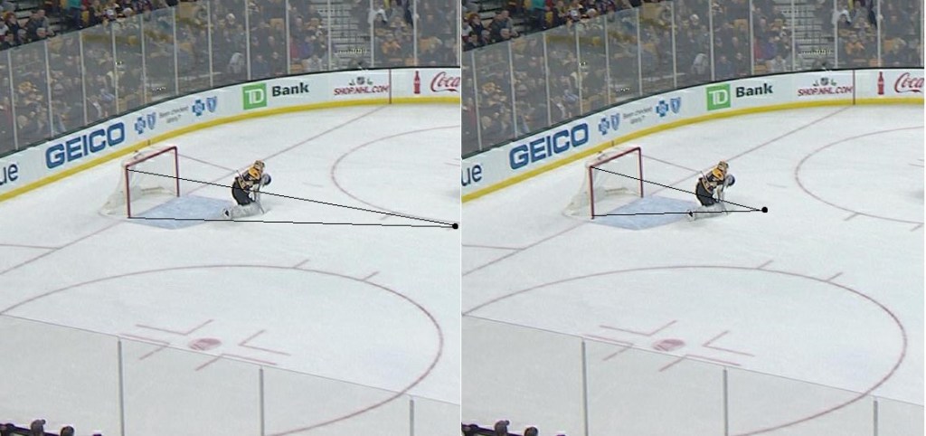 Look at the images below. Notice how much steeper of an angle it is when the puck is closer to the net? The deeper (depth) into the angle your goalie is, the less chance it has of going up over them or to the side and past them.