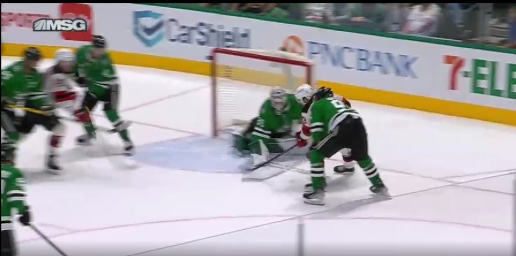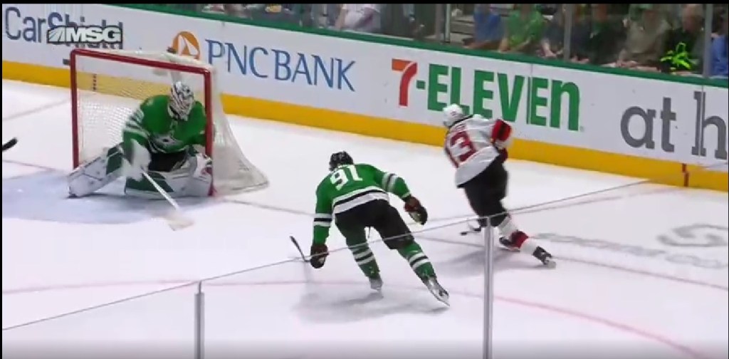 …and swing and a miss! Jake Oettinger of the Dallas Stars probably wants that goal back.